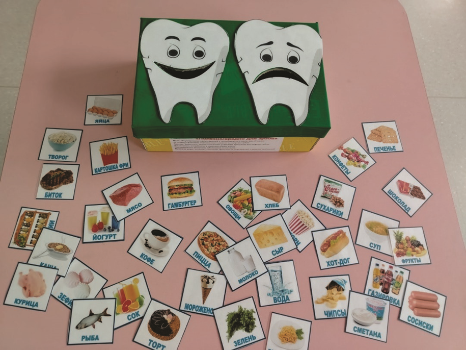 - воспитывать бережное отношение к зубам, их здоровью. Оборудование: - карточки с изображением вредных и полезных для здоровья зубов предметов, дидактическая игра «Полезно/вредно для зубов», аудиозапись песни