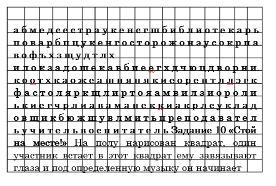 Дорогие ребята, придя в школу на своём пути вы встречает не только учителей разных специальностей, но и представителей других профессий. Шифровальщики зашифровали слова, вам предстоит расшифровать этот магический квадрат, где среди букв спрятаны слова да не только слова, а названия профессий, которые встречаются в вашей школе: медсестра, сторож, психолог, повар, воспитатель, уборщик, няня, бухгалтер, водитель, дворник, сантехник, столяр, электрик, кочегар, кладовщик, учитель, преподаватель, библиотекарь.