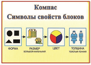 Педагог объясняет всем присутствующим, что такое блоки Дьенеша. Обращает внимание на четыре свойства блоков: цвет, форма, размер и толщина, которые обозначаются символами. Из символов складываются схемы различные построек.