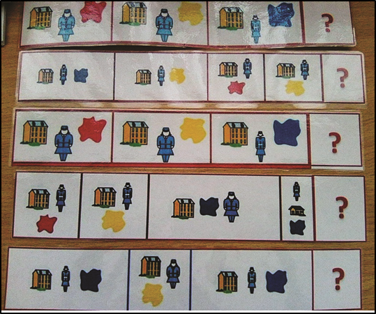Педагог создает проблемную ситуацию, рассказывает и показывает карту (зашифрованную символами), ведущую к поиску клада, тем самым поддерживает интерес к игре. В помощь кладоискателям педагог предлагает необычный «компас- карточку с символами свойств».
